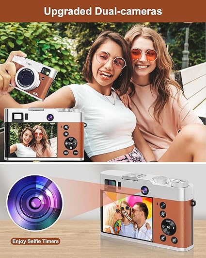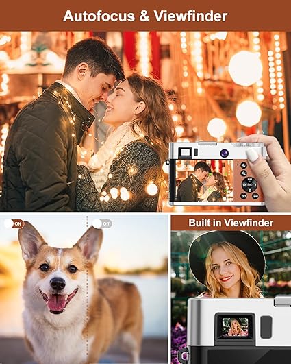 - 【Dual-Camera & Built in Viewfinder】—– Our digital camera for photography upgraded dual-camera configuration, taking selfies is now easier than ever, include front and rear camera, just use one button could switch shooting modes, and the viewfinder on the 5k digital camera allowed you to save a lot of power to take more clear pictures during your trip, reduce the impact of strong light on the eyes, the flash viewfinder adds a touch of nostalgia while providing an extra level of control over framing and composition, enables real-time composition.