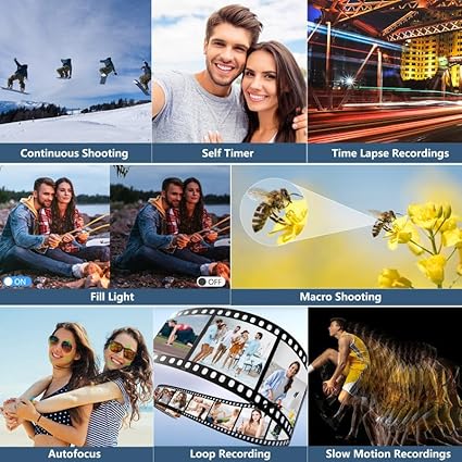 - 【Multifunctional Point and Shoot Digital Cameras】The 4k digital camera for photography is multifunctional in that it has four photo modes(Continuous shooting/Timed shooting/Auto photo mode/Normal photo mode)and four video modes(Time lapse recording/Loop recording/Slow motion recording/Normal video mode), along with a variety of filters. One camera can fulfill all your photography needs