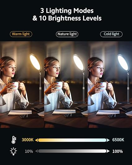 - Customizable Lighting Options: Vimose ring light for desk features 3 color modes (warm, natural, and cool) and 10 brightness levels, allowing you to easily adjust the color temperature and brightness to suit your needs. It comes with a 5V/2A power adapter, greatly enhancing the quality of your photos and videos.